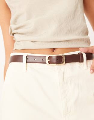 Cinturón marrón oscuro estrecho con hebilla dorada rectangular de Mango