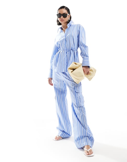 Conjunto azul a rayas de camisa y pantalones de pernera recta con lazada en la cintura de Mango