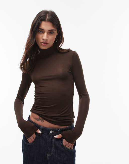 Top marrón oscuro de manga larga con cuello alto de tejido suave de Mango