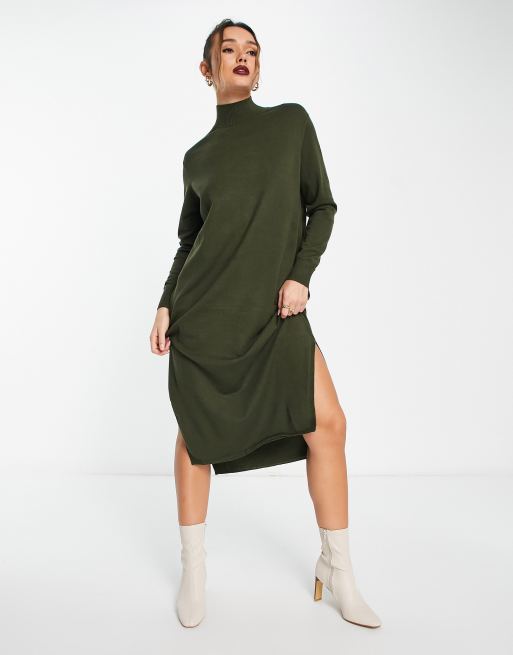 Vestido midi caqui de manga larga con abertura en la pierna de punto de Mango