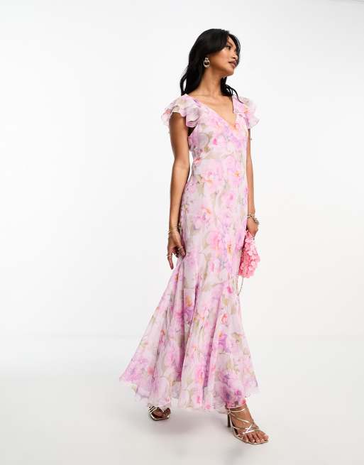 Vestido midi rosa claro con estampado floral y bajo asimétrico premium de Mango