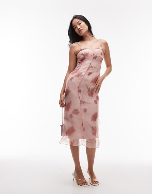 Vestido midi rosa pastel con diseño de dos capas y cuello de pico de Mango