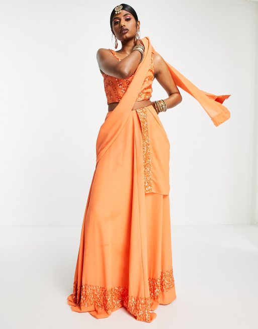 Falda larga naranja mandarina estilo lehenga con bandas adornadas de Maya