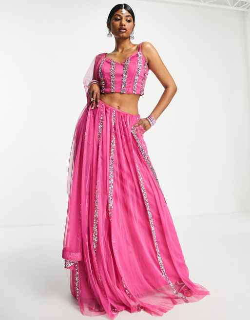 Falda larga rosa estilo lehenga con diseño adornado lineal de Maya