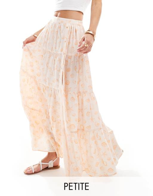 Falda larga escalonada con detalle de botones y estampado de conchas de Miss Selfridge Petite