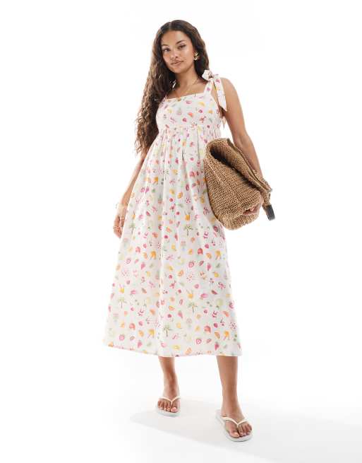 Vestido largo de tirantes anudados con estampado frutal de Miss Selfridge Petite