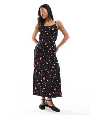 Vestido lencero largo negro de tirantes con estampado de florecitas y cuello ancho de Miss Selfridge Petite