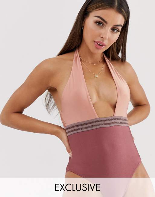 Bañador con cuello halter y cinta en rosa exclusivo de Miss Selfridge