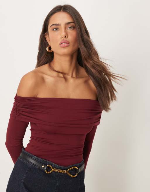 Body burdeos de manga larga con escote Bardot de Miss Selfridge