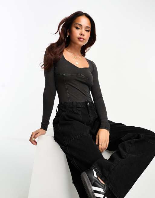 Body gris de manga larga con detalle de corsé y lavado ácido de Miss Selfridge
