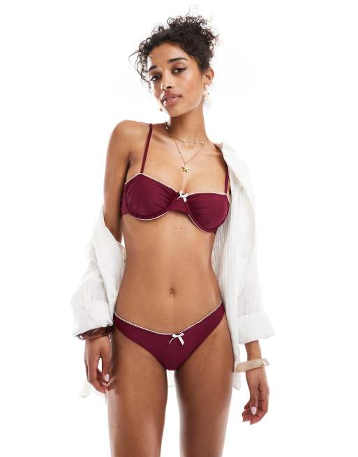 Braguitas de bikini burdeos con cinturilla de pico y ribete de puntilla de Miss Selfridge