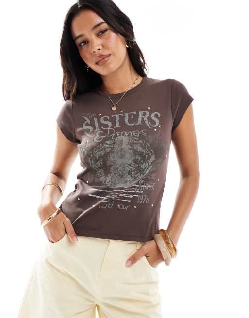 Camiseta larga marrón con diseño encogido, estampado gráfico "Sisters" y tachuelas de Miss Selfridge