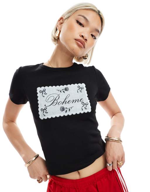 Camiseta negra con diseño encogido y estampado gráfico "Boheme" de Miss Selfridge