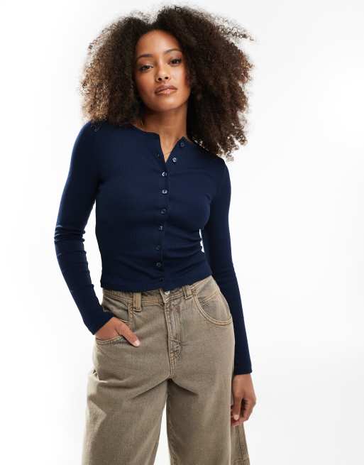 Cárdigan azul marino abotonado con cuello redondo de canalé de Miss Selfridge