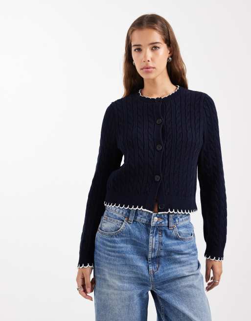 Cárdigan azul marino de punto de ochos con detalle de pespuntes de festón de Miss Selfridge