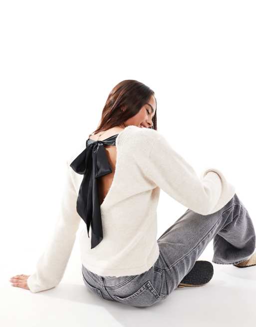 Jersey color avena con cuello de pico y lazo de satén en contraste de Miss Selfridge