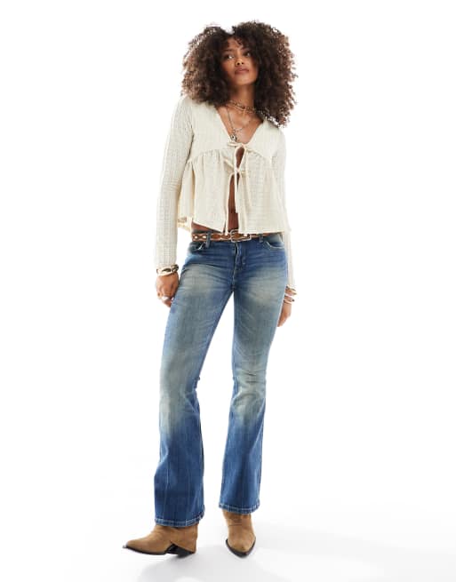 Top color crema de manga larga con lazadas delanteras y sobrefalda de Miss Selfridge