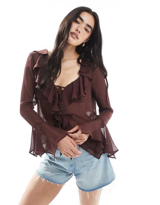 Top marrón con lazada delantera y volantes de chifón de Miss Selfridge