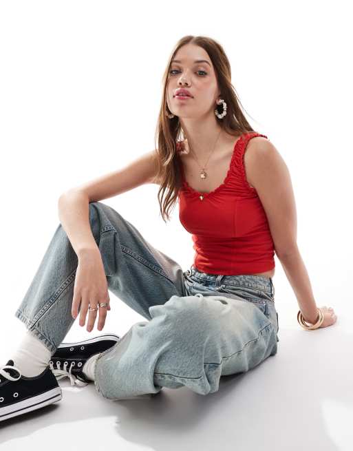 Top rojo estilo mesonera con detalle de rosa de Miss Selfridge