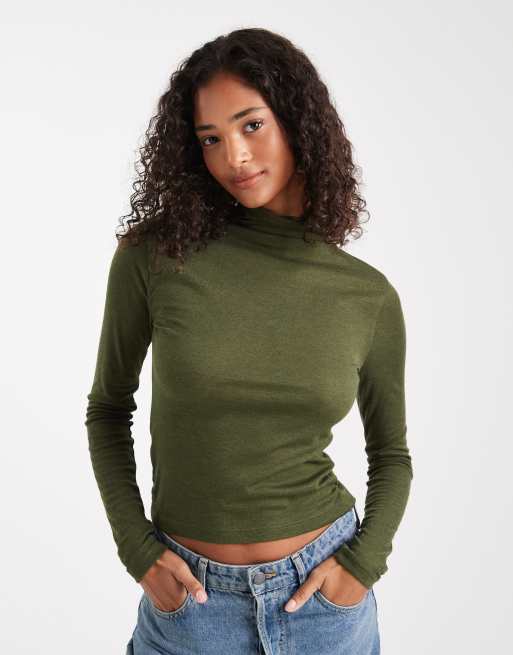 Top verde oliva de manga larga con cuello subido de punto fino de Miss Selfridge