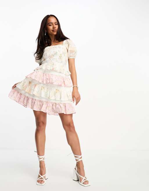 Vestido corto con detalle de volante, inserto de encaje y estampado variado de Miss Selfridge