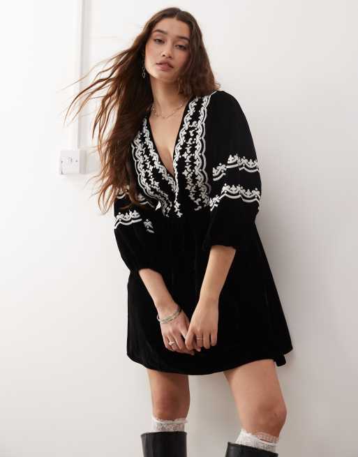 Vestido corto negro de terciopelo con bordados de Miss Selfridge
