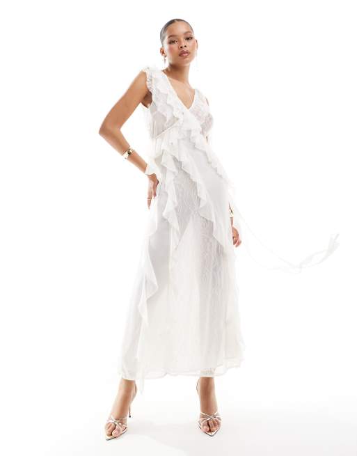 Vestido largo blanco marfil con detalle de volantes de encaje y chifón de Miss Selfridge