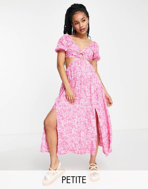 Vestido largo rosa con detalle de anilla, abertura y estampado de hibisco de Miss Selfridge Petite