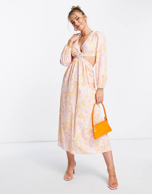Vestido midi rosa con estampado ondulado, detalle de anilla y abertura de Miss Selfridge