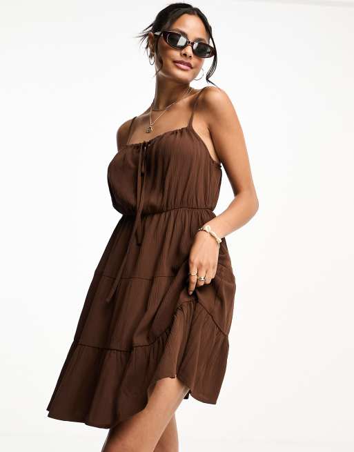 Vestido veraniego corto marrón chocolate de tirantes con cintura fruncida de Miss Selfridge