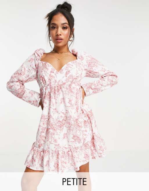 Vestido corto con estampado rosa, diseño cruzado y volantes en el bajo de Missguided Petite