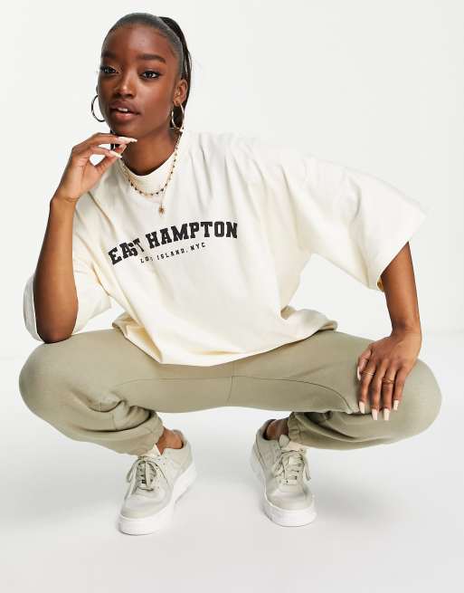 Camiseta color crema con estampado gráfico "East Hampton" de Missguided