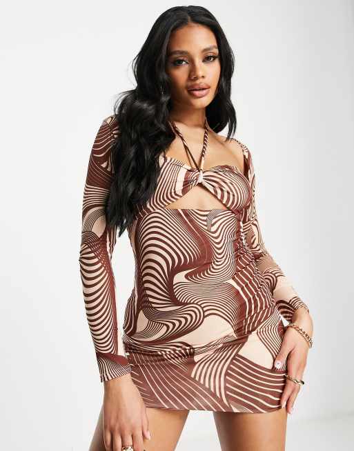 Vestido corto marrón con estampado de ilusión óptica, cuello halter y aberturas de Missguided