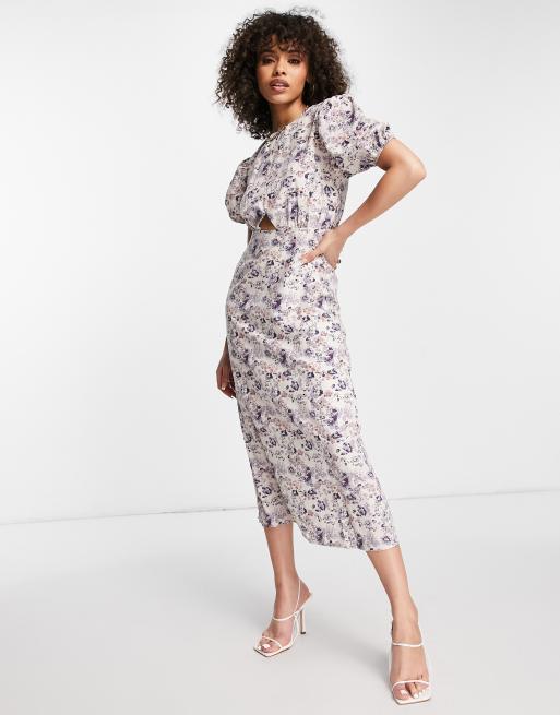 Vestido midi lila con mangas abullonadas, aberturas y estampado floral de Missguided