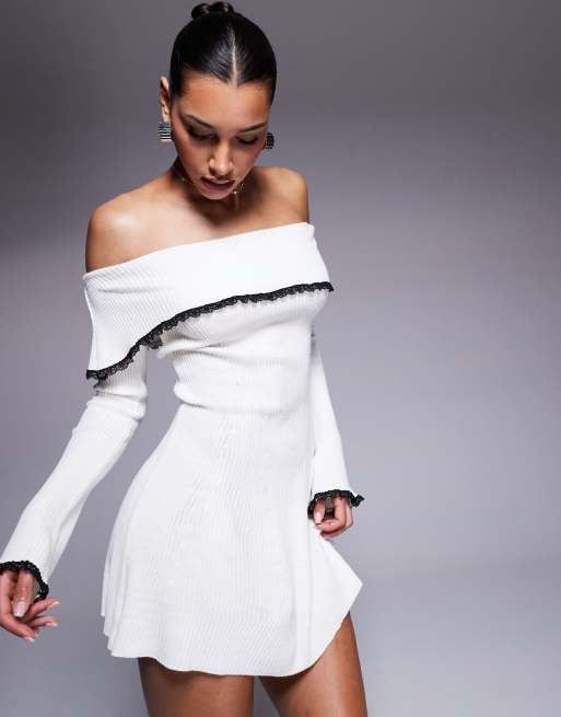 Vestido corto blanco de punto con escote Bardot plegado y ribete de encaje de Missy Empire