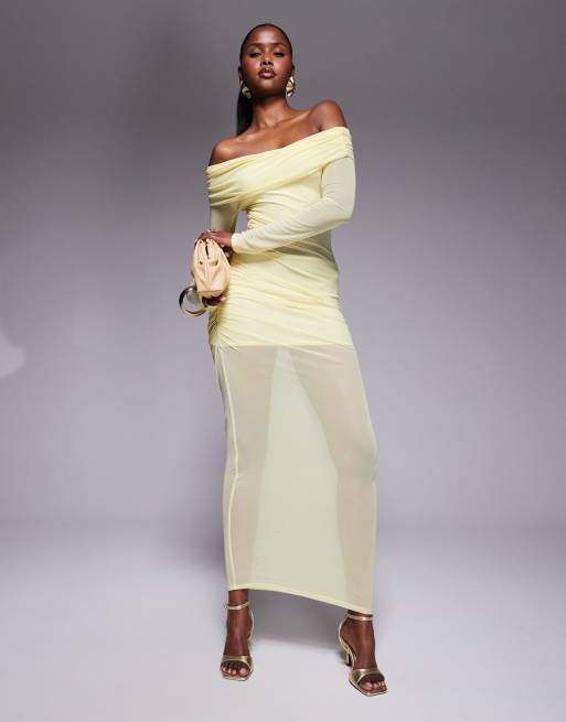 Vestido largo amarillo con escote Bardot e inserto de malla de Missy Empire