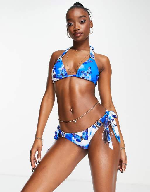Braguitas de bikini azules anudadas a los lados con estampado de mariposas y pedrería Give Me Butterflies Armour de Moda Minx