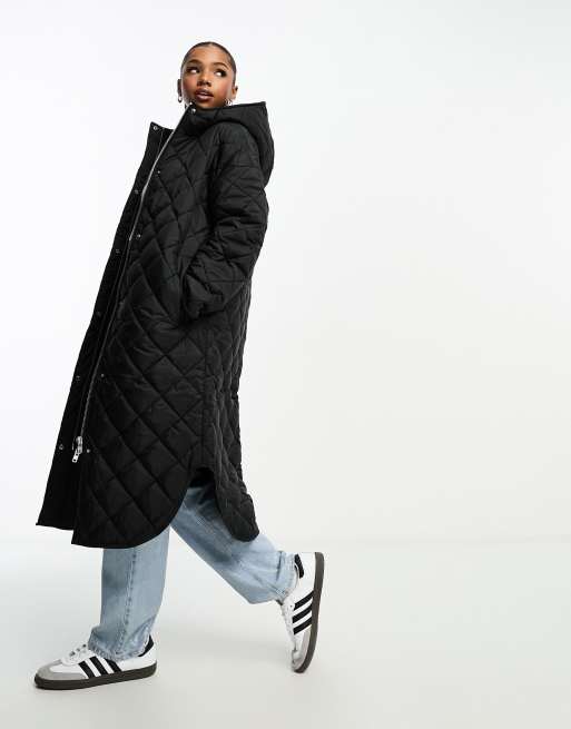 Abrigo largo negro acolchado con capucha de Monki