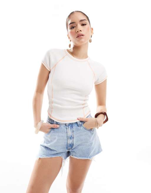 Camiseta blanca de corte slim con diseño encogido y ribetes naranjas en contraste de Monki