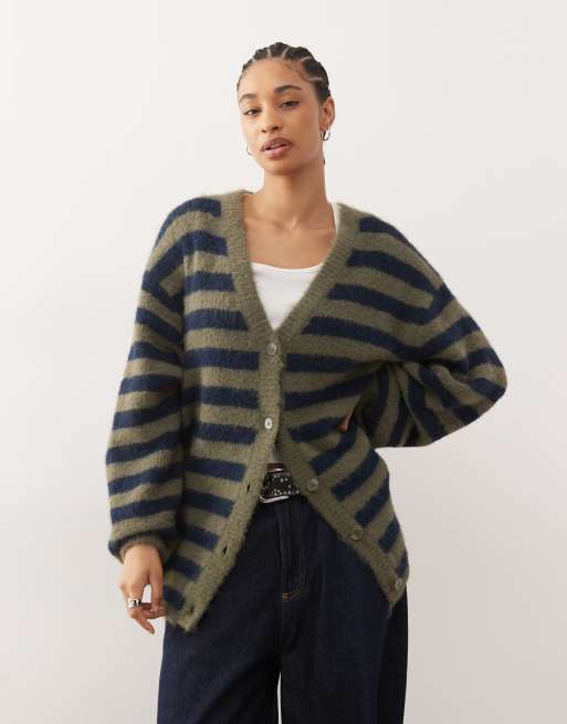 Cárdigan verde oliva y azul marino a rayas extragrande de punto de Monki