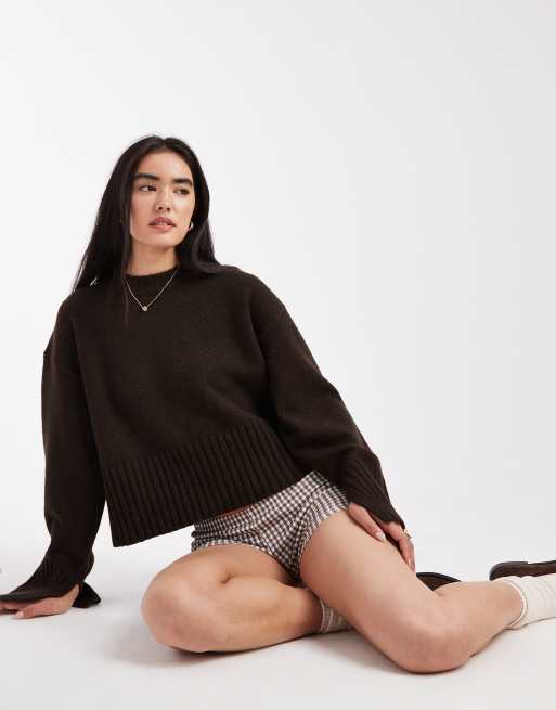 Jersey marrón chocolate oscuro de cuello redondo con detalle en el bajo y puños acanalados de punto de Monki