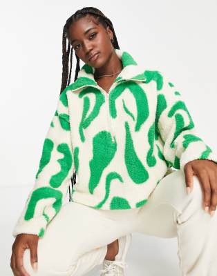 Sudadera verde y blanca estampada con cremallera en la parte delantera de borreguito de Monki