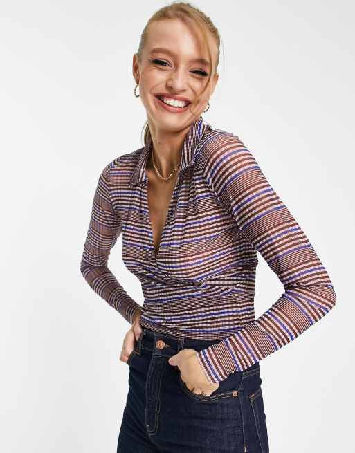 Top gris con estampado de cuadros y solapas de malla de Monki
