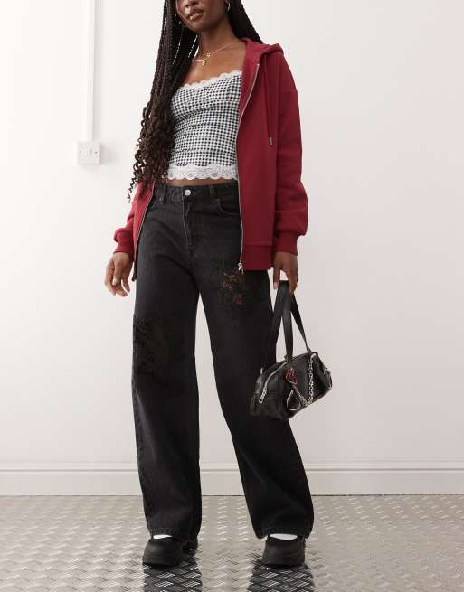 Vaqueros negros de corte suelto y talle bajo con detalle de abertura de encaje Missy de Monki
