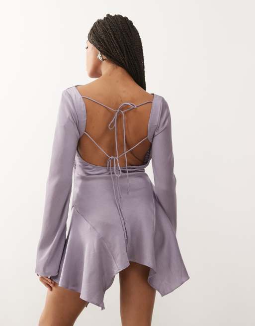 Vestido corto lila de manga larga con vuelo y espalda abierta con lazada de satén efecto rugoso de Monki