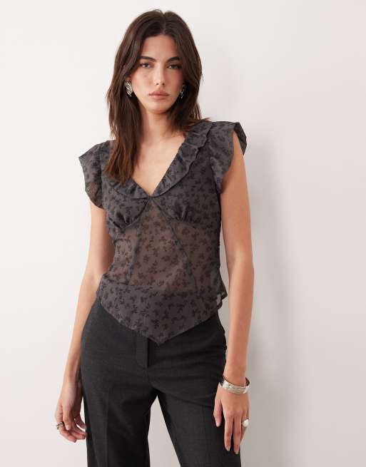 Top gris con detalle de volante y estampado floral de tejido transparente Paquita de Motel