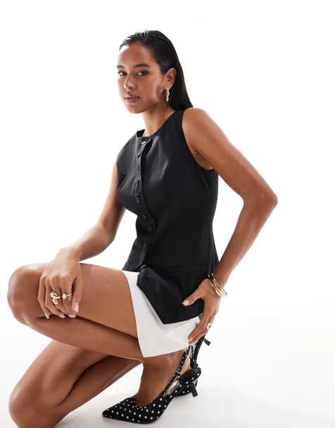 Chaleco de traje caqui abotonado con cuello halter de mezcla de lino de Miss Selfridge