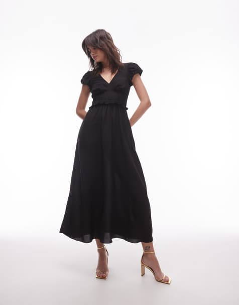 MÁS COLORESVestido camisero midi negro de manga larga con diseño fruncido y cuello abierto de solapas de Topshop
