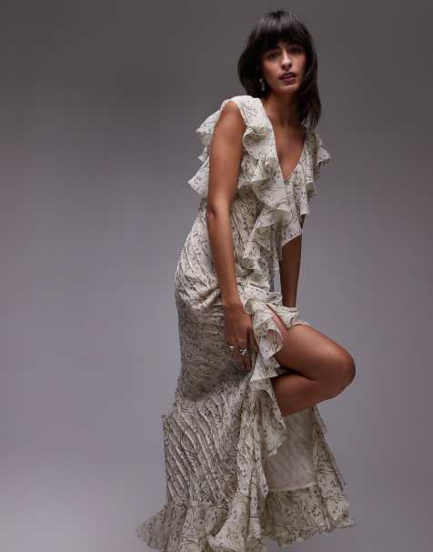 Vestido gris pálido con estampado floral, jaretas y volantes premium de Topshop