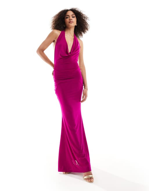Vestido largo rosa fucsia de corte sirena con cuello desbocado pronunciado de Murci